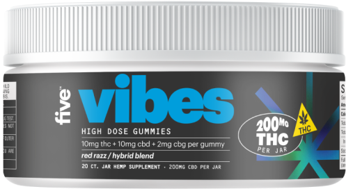 vibe with five gummies, crafted with 10mg delta-9 thc and other cannabinoids for a balanced, hybrid-like buzz. enjoy the delicious red razz flavor and feel the immaculate vibes anytime, anywhere.